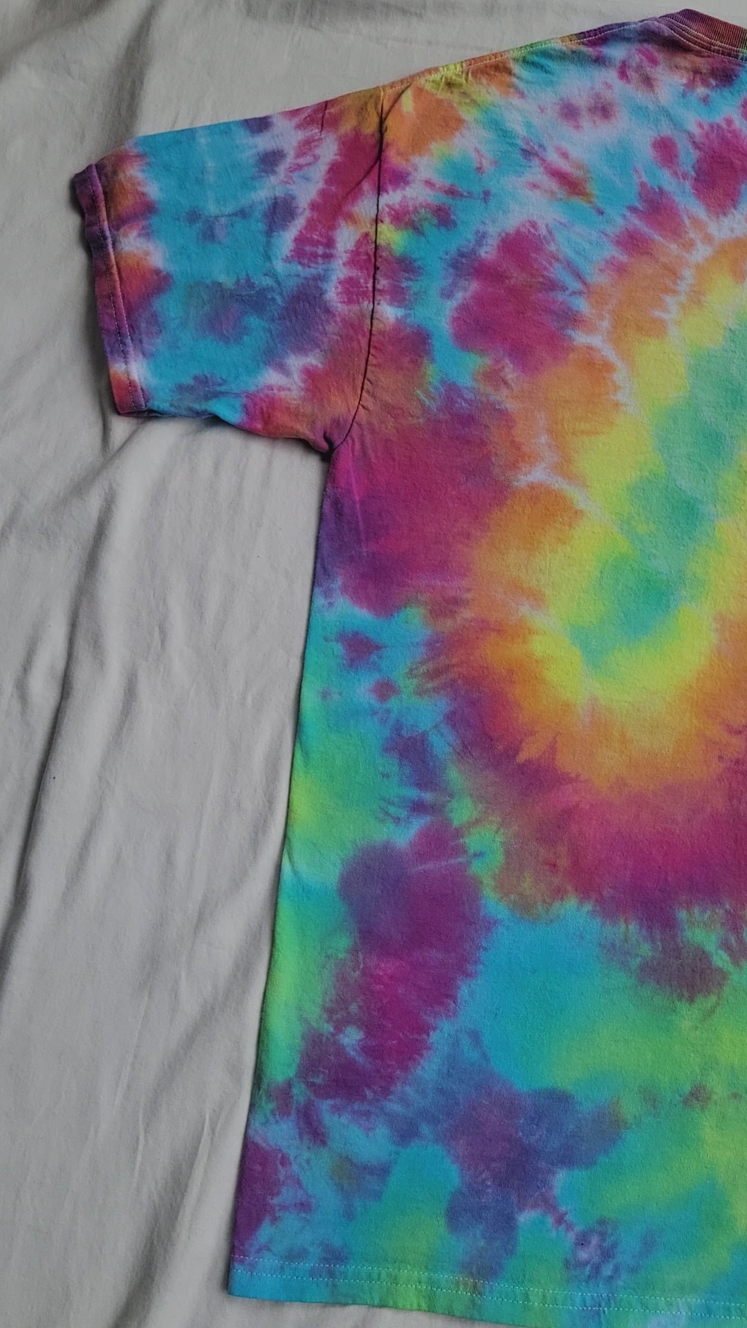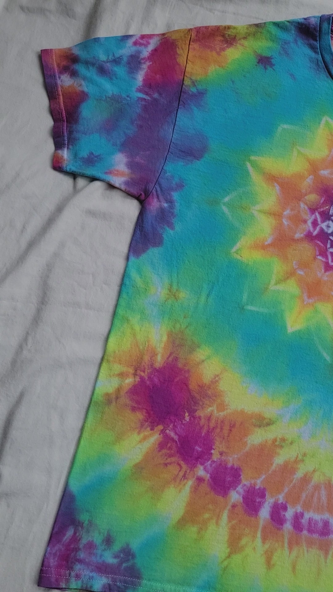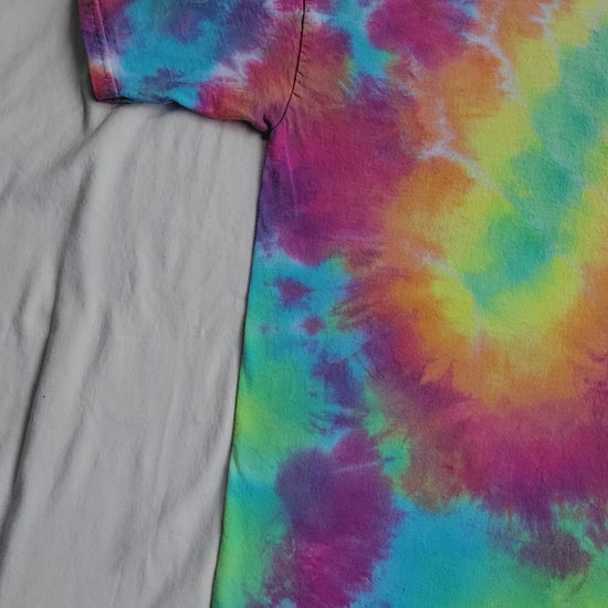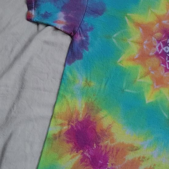 Tie dyed pastel rainbow colored flower mandala t-shirt with symmetrical patterns on the back. Size Large, 100% cotton.