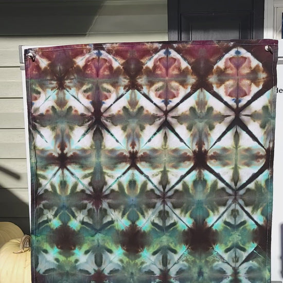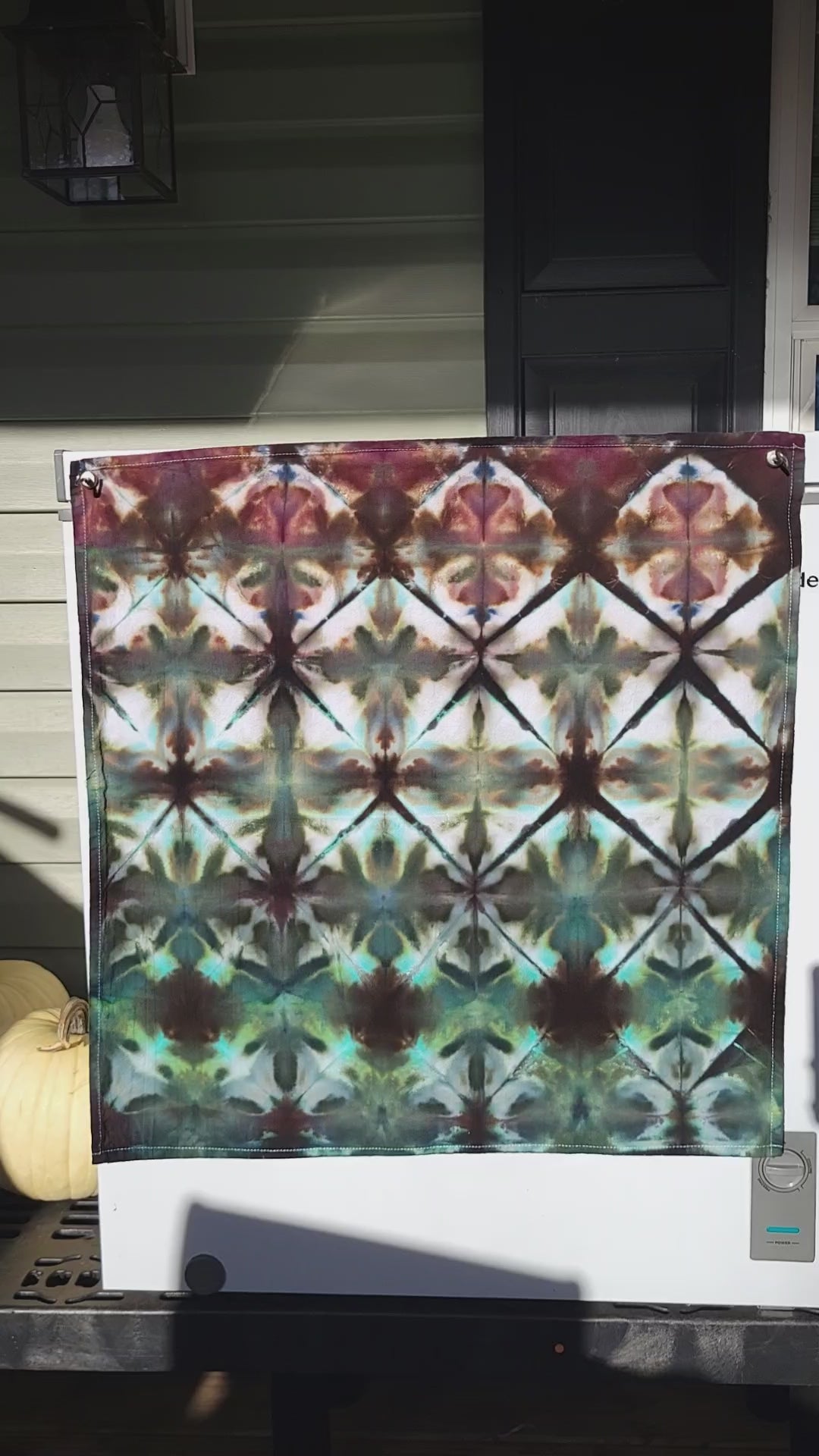 100% flour sack kitchen towel with a hanging loop. Browns and greens in a geometric pattern. Super absorbent! Size: 28" x 28"